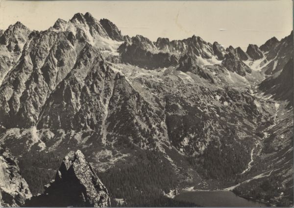 Tatrzański Park Narodowy [Słowacja]. Widok ze Skrajnej Baszty na Popradzki Staw i Dolinę Złomisk. W tle Rysy, Kopa Popradzka, Ciężki Szczyt, Wysoka, Smoczy Szczyt, Ganek, Rumanowy Szczyt, Żelazne Wrota i Zmarzły Szczyt.