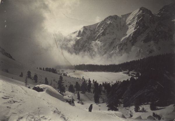 Widok na Popradzki Staw i Dolinę Mięguszowiecką z Doliny Złomisk w scenerii zimowej. Nad wschodnim brzegiem stawu widoczny hotel górski kpt. Stefana Moravki otoczony lasem. W tle południowa grań Skrajnej Baszty oraz Mała Baszta.