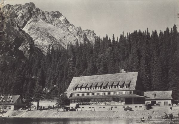 TATRANSKÝ NÁRODNÝ PARK Chata kpt. Morávku (1500 m) pri Popradskom plese (1494 m), v Mengusovskej doline. V pozadí Predná Bašta (2364 m)