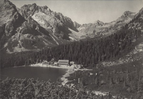 Tatrzański Park Narodowy [Słowacja]. Popradzki Staw z hotelem górskim kpt. Stefana Moravki. Po lewej Szatan, na wprost Koprowy Wierch, na prawo Wołowiec Mięguszowiecki.