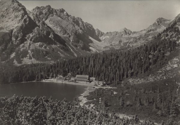 Widok na Popradzki Staw. Na pierwszym planie kosodrzewina (Pinus mugo Turra). W centralnej czę¶ci hotel górski kpt. Stefana Moravki otoczony lasem. W tle szczyty: na lewo Szatan, na wprost Koprowy Wierch, na prawo Wołowiec Mięguszowiecki.