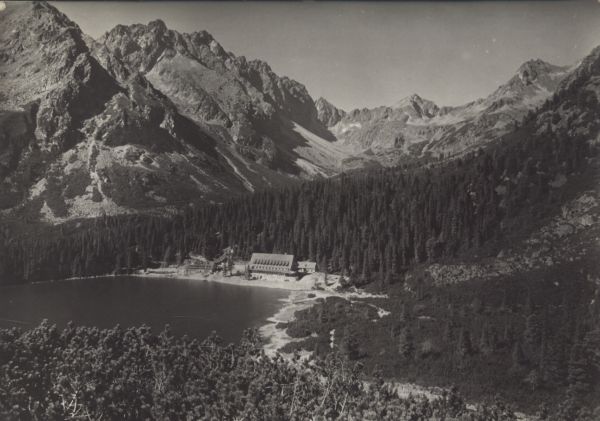 Tatrzański Park Narodowy [Słowacja]. Popradzki Staw z hotelem górskim kpt. Stefana Moravki. Po lewej Szatan, na wprost Koprowy Wierch, na prawo Wołowiec Mięguszowiecki.