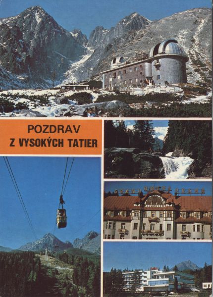 POZDRAV Z VYSOKÝCH TATIER VYSOKÉ TATRY - VYSOKIE TATRY - HOHE TATRA - THE HIGH TATRAS Astronomický ústav SAV pri Skalnatom plese. Kabinková lanovka. Vodopád vo Veľkej Studenej doline. Grandhotel Praha v Tatranskej Lomnici. Zotavovňa ROH Morava