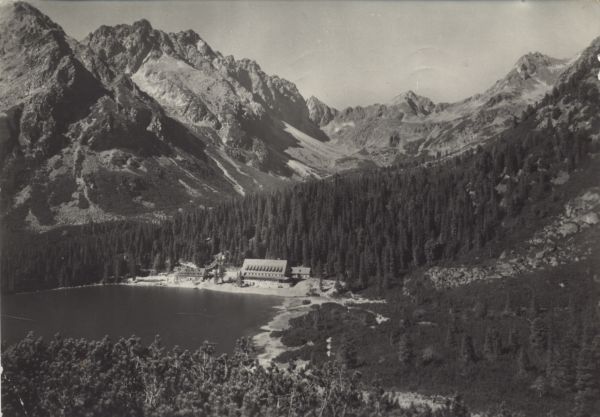 Widok na Popradzki Staw. Na pierwszym planie kosodrzewina (Pinus mugo Turra). W centralnej części hotel górski kpt. Stefana Moravki otoczony lasem. W tle szczyty: na lewo Szatan, na wprost Koprowy Wierch, na prawo Wołowiec Mięguszowiecki.