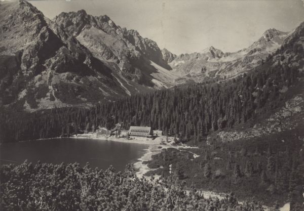 Tatrzański Park Narodowy [Słowacja]. Popradzki Staw z hotelem górskim kpt. Stefana Moravki. Po lewej Szatan, na wprost Koprowy Wierch, na prawo Wołowiec Mięguszowiecki.