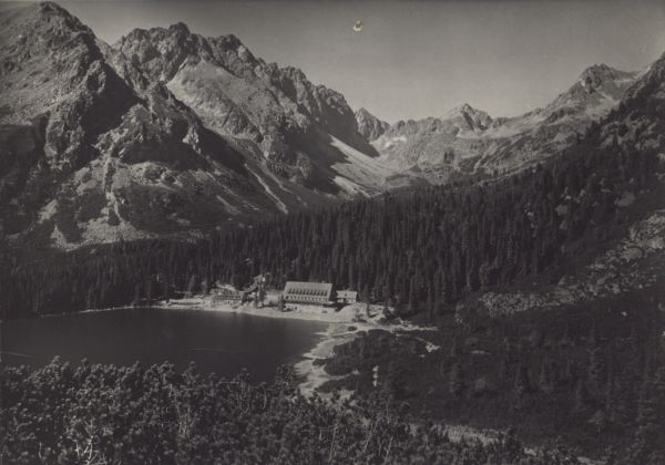 Tatrzański Park Narodowy [Słowacja]. Popradzki Staw z hotelem górskim kpt. Stefana Moravki. Po lewej Szatan, na wprost Koprowy Wierch, na prawo Wołowiec Mięguszowiecki.