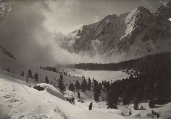 Widok na Popradzki Staw i Dolinę Mięguszowiecką z Doliny Złomisk w scenerii zimowej. Nad wschodnim brzegiem stawu widoczny hotel górski kpt. Stefana Moravki otoczony lasem. W tle południowa grań Skrajnej Baszty oraz Mała Baszta.