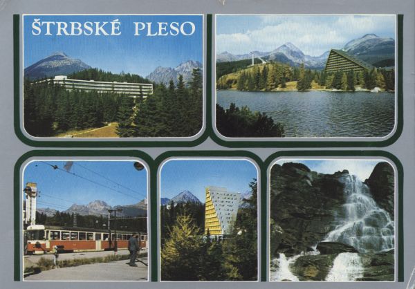 Tatrzański Park Narodowy [Słowacja]. Wysokie Tatry - Szczyrbskie Jezioro. Sanatorium Helios. Szczyrbskie Jezioro z Hotelem Patria. Stacja kolejowa. Hotel Panorama. Wodospad Skok.