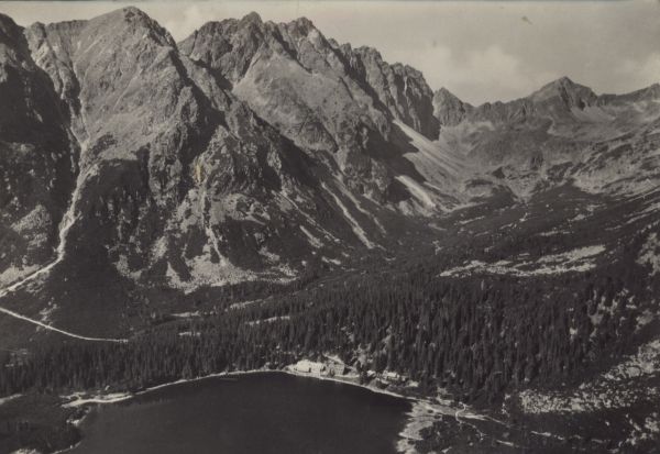 Widok na Popradzki Staw i Dolinę Mięguszowieck±. Nad górnym brzegiem stawu widoczny hotel górski otoczony lasem. W tle szczyty: Mała Baszta, Po¶rednia Baszta, Szatan, Zadnia Baszta, Koprowa Przełęcz i Koprowy Wierch.