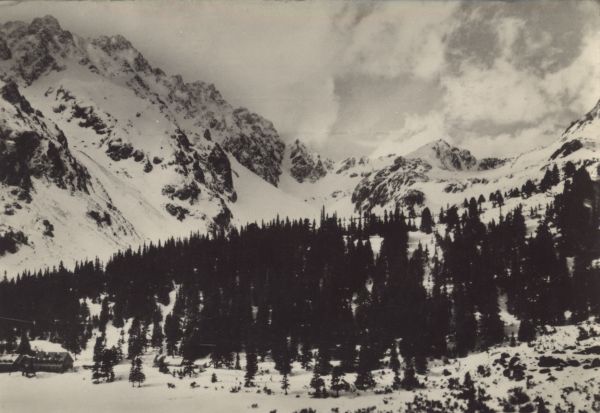 Widok na Dolinę Mięguszowiecką w scenerii zimowej. na pierwszym planie las. Po lewej stronie zamarznięty Popradzki Staw oraz schronisko kpt. Morawki. W tle szczyty: Pośrednia Baszta, Szatan, Zadnia Baszta i Koprowy Wierch.