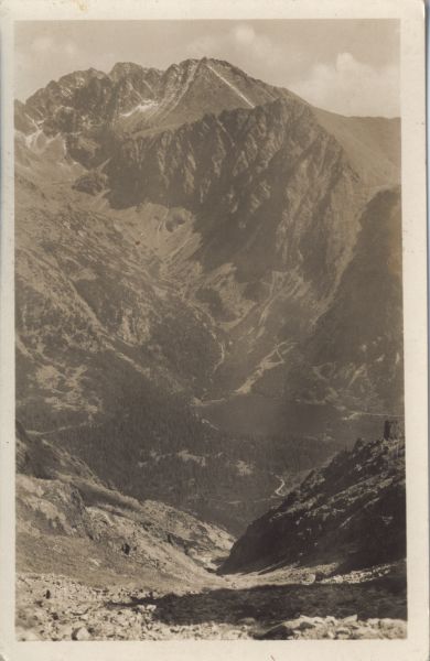 Widok na Dolinę Złomisk i Popradzki Staw. Na pierwszym planie stok, w głębi las i Popradzki Staw oraz szczyty otaczające Dolinę Złomisk: Tępa i Kończysta. W tle Gerlach.