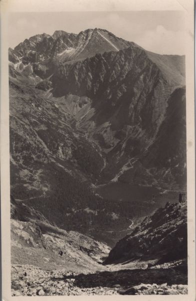 Widok na Dolinę Złomisk i Popradzki Staw. Na pierwszym planie stok, w głębi las i Popradzki Staw oraz szczyty otaczające Dolinę Złomisk: Tępa i Kończysta. W tle Gerlach.