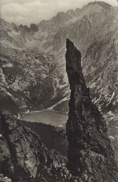 Widok na Popradzki Staw i Dolinę Złomisk. Na pierwszym planie Basztowa Igła w Skrajnej Baszcie. W tle szczyty otaczające Dolinę Złomisk, od lewej Śnieżna Kopa, Wschodni Żelazny Szczyt, Zmarzły Szczyt i Kończysta.