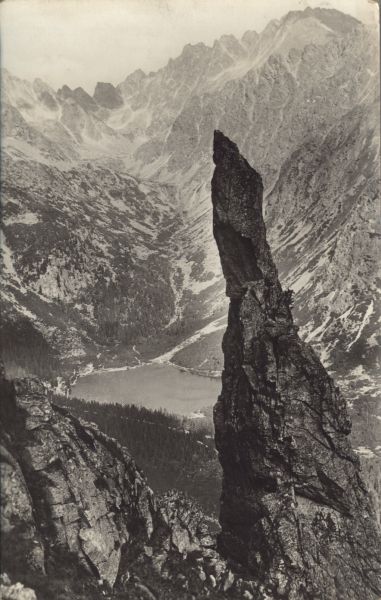 Widok na Popradzki Staw i Dolinę Złomisk. Na pierwszym planie Basztowa Igła w Skrajnej Baszcie. W tle szczyty otaczające Dolinę Złomisk, od lewej Śnieżna Kopa, Wschodni Żelazny Szczyt, Zmarzły Szczyt i Kończysta.