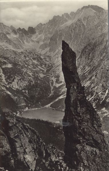 Widok na Popradzki Staw i Dolinę Złomisk. Na pierwszym planie Basztowa Igła w Skrajnej Baszcie. W tle szczyty otaczające Dolinę Złomisk, od lewej Śnieżna Kopa, Wschodni Żelazny Szczyt, Zmarzły Szczyt i Kończysta.