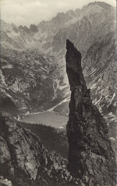 Widok na Popradzki Staw i Dolinę Złomisk. Na pierwszym planie Basztowa Igła w Skrajnej Baszcie. W tle szczyty otaczające Dolinę Złomisk, od lewej Śnieżna Kopa, Wschodni Żelazny Szczyt, Zmarzły Szczyt i Kończysta.