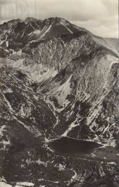 Widok na Dolinę Złomisk i Popradzki Staw. Na pierwszym planie las, w głębi Popradzki Staw oraz szczyty otaczające Dolinę Złomisk: Tępa i Kończysta. W tle Gerlach.