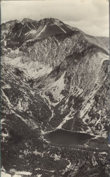 Widok na Dolinę Złomisk i Popradzki Staw. Na pierwszym planie las, w głębi Popradzki Staw oraz szczyty otaczające Dolinę Złomisk: Tępa i Kończysta. W tle Gerlach.