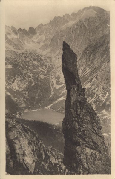 Widok na Popradzki Staw i Dolinę Złomisk. Na pierwszym planie Basztowa Igła w Skrajnej Baszcie. W tle szczyty otaczające Dolinę Złomisk, od lewej Śnieżna Kopa, Wschodni Żelazny Szczyt, Zmarzły Szczyt i Kończysta.
