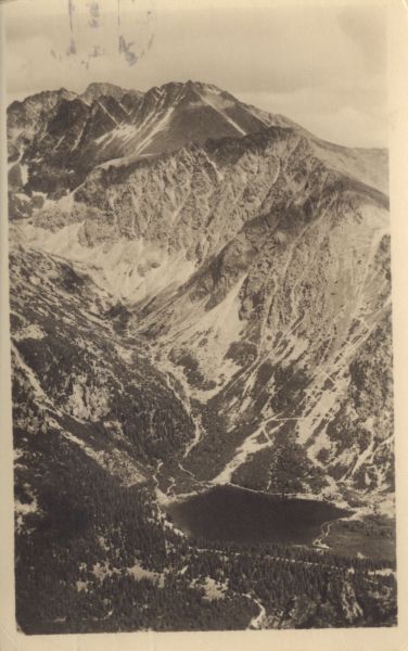 Widok na Dolinę Złomisk i Popradzki Staw. Na pierwszym planie las, w głębi Popradzki Staw oraz szczyty otaczające Dolinę Złomisk: Tępa i Kończysta. W tle Gerlach.