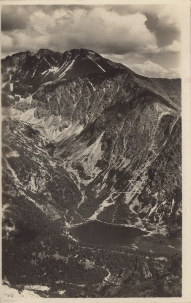 Widok na Dolinę Złomisk i Popradzki Staw. Na pierwszym planie las, w głębi Popradzki Staw oraz szczyty otaczające Dolinę Złomisk: Tępa i Kończysta. W tle Gerlach.