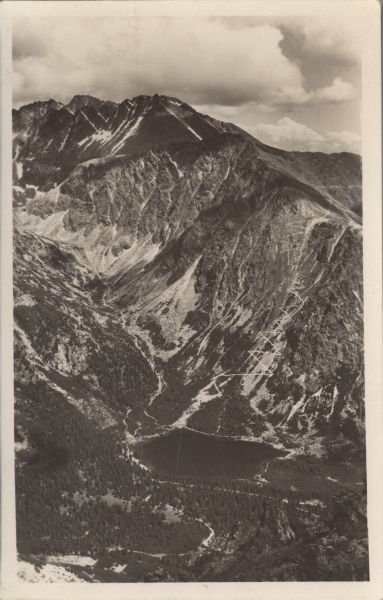 Pocztówka użyta w obiegu pocztowym, znaczek oderwany, korespondencja. Logotyp wydawcy. Dodatkowo pieczęć: P.P. Chata [] Popradské Pleso 1513 m.