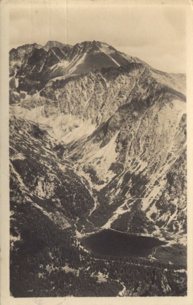 Widok na Dolinę Złomisk i Popradzki Staw. Na pierwszym planie las, w głębi Popradzki Staw oraz szczyty otaczające Dolinę Złomisk: Tępa i Kończysta. W tle Gerlach.