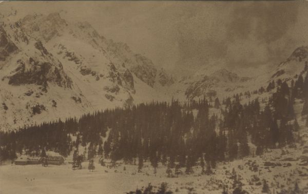 Widok na Dolinę Mięguszowiecką w scenerii zimowej. Na pierwszym planie las. Po lewej stronie zamarznięty Popradzki Staw oraz schronisko. W tle szczyty: Pośrednia Baszta, Szatan, Zadnia Baszta i Koprowy Wierch.
