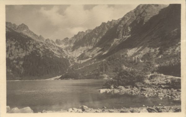 Widok na Popradzki Staw i Dolinę Złomisk. Na pierwszym planie skały, po prawej stronie kosodrzewina (Pinus mugo Turra). W tle szczyty otaczające Dolinę Złomisk: Złomiska Turnia, Wschodnie Żelazne Wrota, Wschodni Szczyt Żelaznych Wrót, Zmarzły Szczyt, północna Grań Kończystej, Tępa i Osterwa.