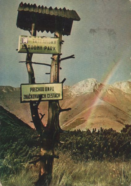 Widok na Skrajne Jatki. Na pierwszym planie słup informacyjny, za nim kosodrzewina (Pinus mugo Turra). Po prawej stronie widoczna tęcza.