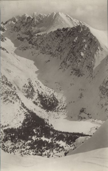 Widok na Dolinę Złomisk i Popradzki Staw w scenerii zimowej. Na pierwszym planie las, w głębi zamarznięty Popradzki Staw. W tle szczyty: (od prawej): Tępa i Kończysta.