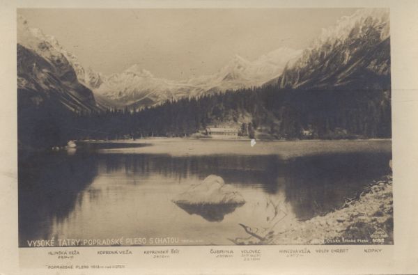 VYSOKÉ TATRY: Popradské Pleso s Chatou 1513 m n. m. Hlinská veža 2334 m, Koprova veža, Koprovský štít 2370 m., Čubrina 2378 m, Volovec Štít Olgy 2216 m., Hincova veža 2377 m., Volov Chrbet, Kopky. Popradské Pleso 1513 m nad moŕem.