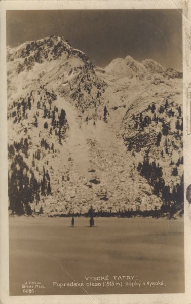 Widok na Popradzki Staw. W tle Wysoka i Kopa Popradzka. Na zamarzniętym stawie widoczni narciarze. Na dole zdjęcia wpisany tytuł i nazwisko fotografa.