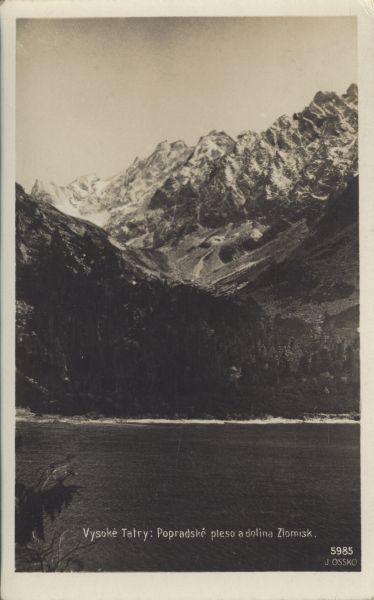 Widok na Dolinę Złomisk i Popradzki Staw. Na pierwszym planie Popradzki Staw oraz szczyty otaczające Dolinę Złomisk. Na dole wpisany tytuł i nazwisko fotografa.