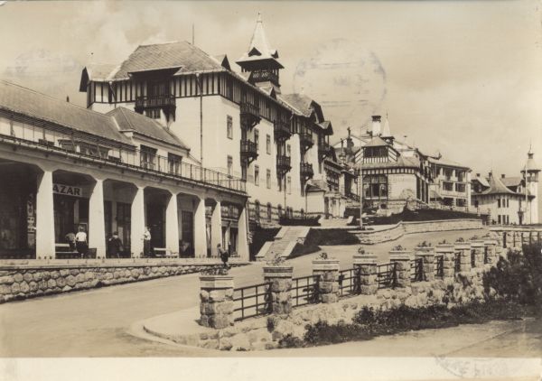 Widok na budynki sanatoryjne: Krywań i Hviezdoslav w Szczyrbskim Jeziorze. Na pierwszym planie ulica.