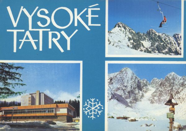 Tatrzańska Łomnica - Dom Wypoczynkowy RZZ Uran. Dolina Łomnicka - Łomnica, grań Wideł i Kieżmarski Szczyt. U góry napis: VYSOKÉ TATRY.
