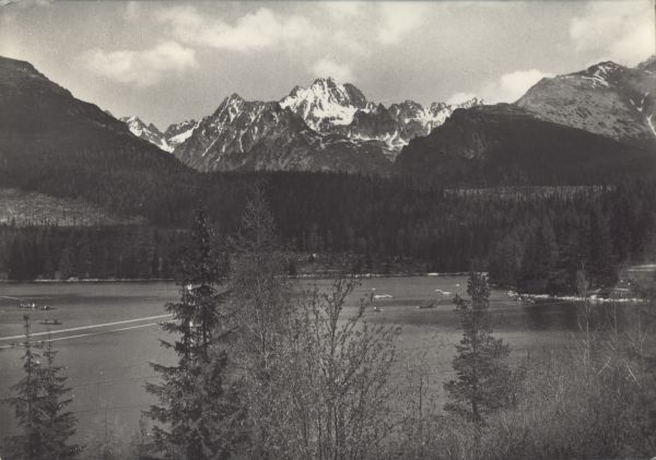 Na pierwszym planie Szczyrbskie Jezioro. Łódki na jeziorze. W tle Wysoka.