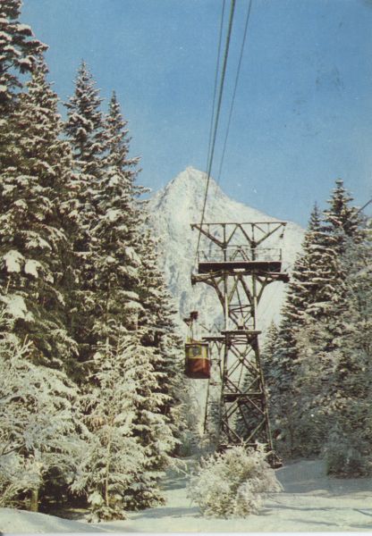 Tatry Wysokie. Kolej linowa do Łomnickiego Stawu. W tle Łomnica. Tytuł również w języku: ros., niem, ang.