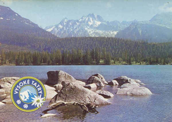 Widok znad Szczyrbskiego Jeziora na ośnieżone szczyty: Kopę Popradzką, Wysoką i Osterwę. Poniżej las. Przy brzegu jeziora głazy. W lewym dolnym rogu logo miasta: VYSOKÉ TATRY.