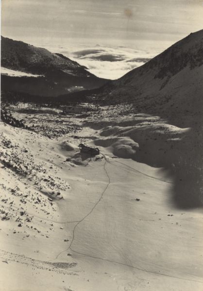 Widok z góry na schronisko przy Zielonym Stawie Kieżmarskim w scenerii zimowej. Na pierwszym planie zasypany śniegiem Zielony Staw Kieżmarski. W tle morze mgieł.