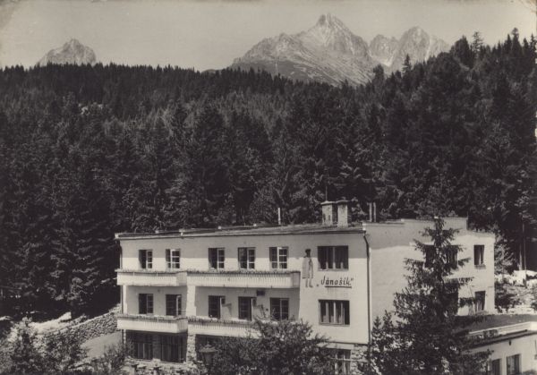 Wysokie Tatry - Tatrzańska Leśna. Dom wczasowy RZZ Janosik. W tle Pośrednia Grań i grupa Łomnicy.
