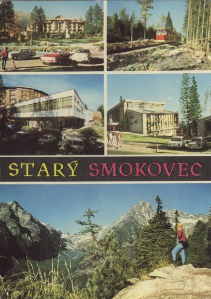 Pocztówka 5. elementowa: Grandhotel. Wagon kolei linowo-terenowej. Hotel Park. Widok ze szlaku na Sławkowski Szczyt i Grań Baszt. Napis: STARĘ SMOKOVEC.