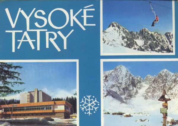 Pocztówka 3. elementowa: Dolina Łomnicka - kolej linowa krzesełkowa na Łomnicê, w tle Łomnica (z lewej), Kieżmarski Szczyt. Tatrzańska Łomnica - Zwi±zkowy Dom Wypoczynkowy Urán. Dolina Łomnicka - Łomnica, widok na Grań Wideł i Kieżmarski Szczyt. Napis: VYSOKÉ TATRY i ¶nieżynka.