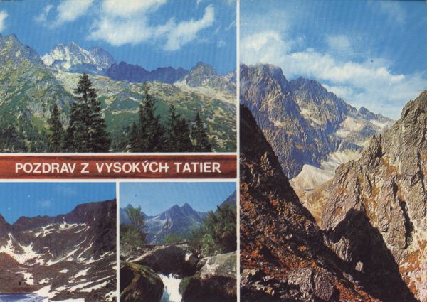 Pocztówka 4. elementowa: Dolina Mięguszowiecka, w tle Wysoka. Wielki Żabi Staw Mięguszowiecki z Żabim Koniem w tle. Dolina Zielonego Stawu Kieżmarskiego. Widok na wschodnie ¶ciany Gerlachu. Napis: Pozdrav z Vysokých Tatier.