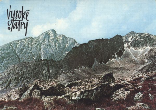 Widok na Krywań. Przed nim grań Ostrej, po prawej stronie Krótka. W lewym rogu u góry napis: Vysoké Tatry.
