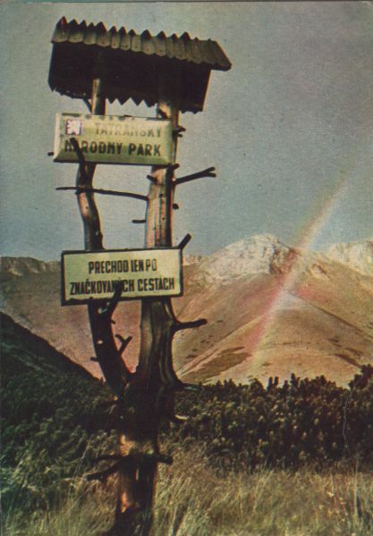 Widok na Skrajne Jatki. Na pierwszym planie słup informacyjny, za nim kosodrzewina (Pinus mugo Turra). Po prawej stronie widoczna tęcza.