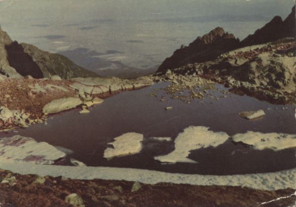 Tatry Wysokie. Dolina Małej Zimnej Wody. Widok znad Małego Stawu Spiskiego na Kotlinę Spisk±. Tytuł również w języku: ros., ang., niem.
