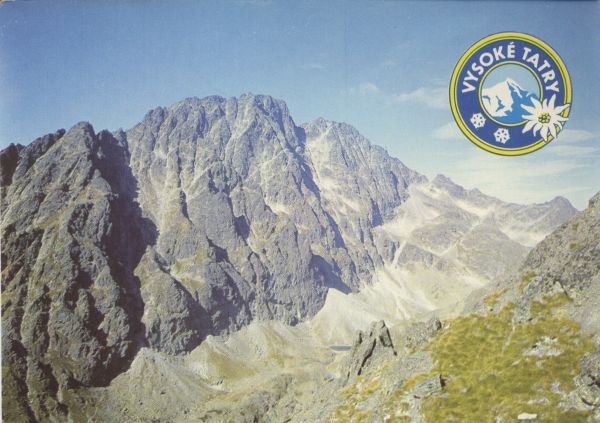 Widok ponad Dolin± Wielick± (Długi Staw) na Masyw Gerlacha - od lewej: Mały Gierlach, Gerlach, Przełęcz Tetmajera, Zadni Gerlach i Wielicki Szczyt. U góry po prawej stronie logo miasta: VYSOKÉ TATRY.