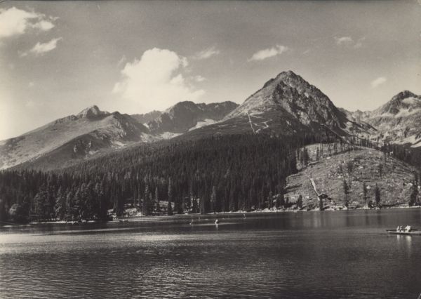 Widok na Szczyrbskie Jezioro i pływaj±ce po nim łódki. W tle od lewej strony szczyty: Krywań, Ostra, Wielkie Solisko i Szczyrbski Szczyt. Pod Skrajnym Soliskiem widoczna skocznia narciarska.