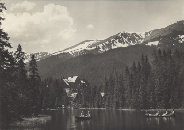 Jasna. Widok na Wrbicki Staw z łódkami i jego otoczenie. Nad stawem Schronisko Mikołaja. W tyle Bory.
